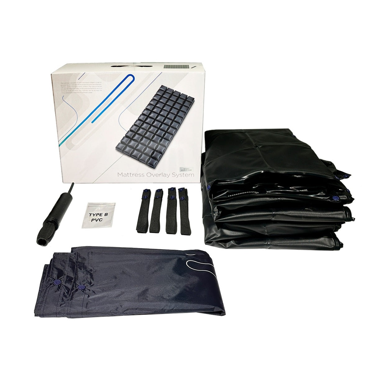 El colchón incluye bombín, correas de fijación para cama o colchón clínico, funda y kit de reparación.