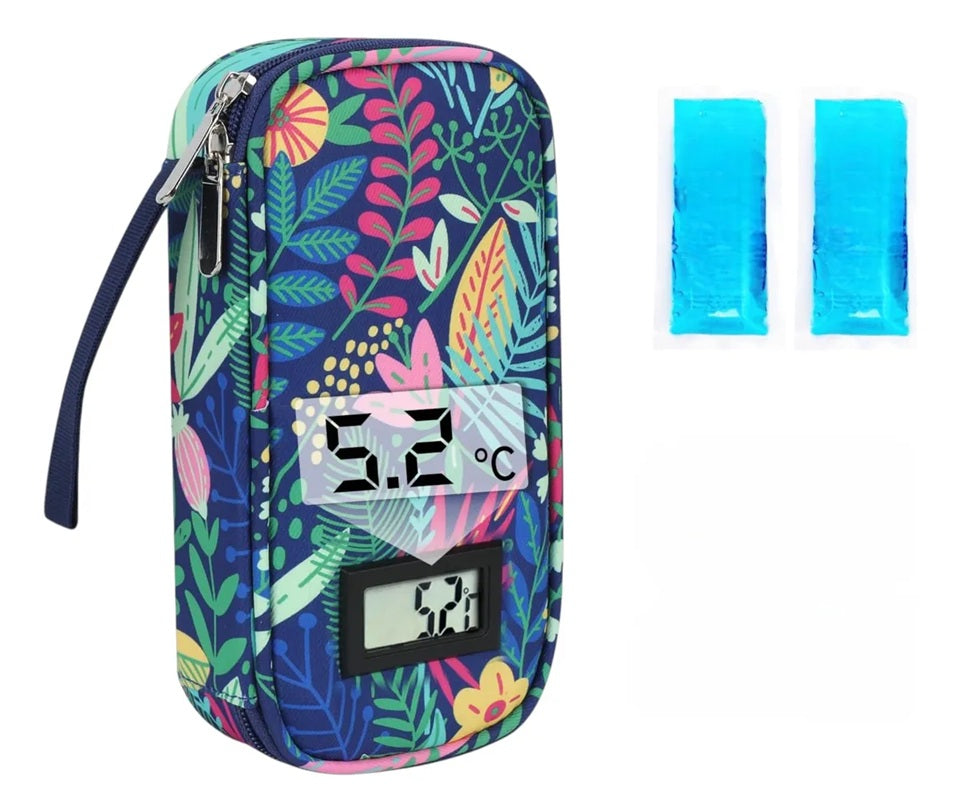 Estuche bolsa cooler para transportar medicamentos e insulina, mantiene las condiciones necesarias cuando no cuentas con refrigerador cerca. La temperatura se muestra solo en grados Fahrenheit.